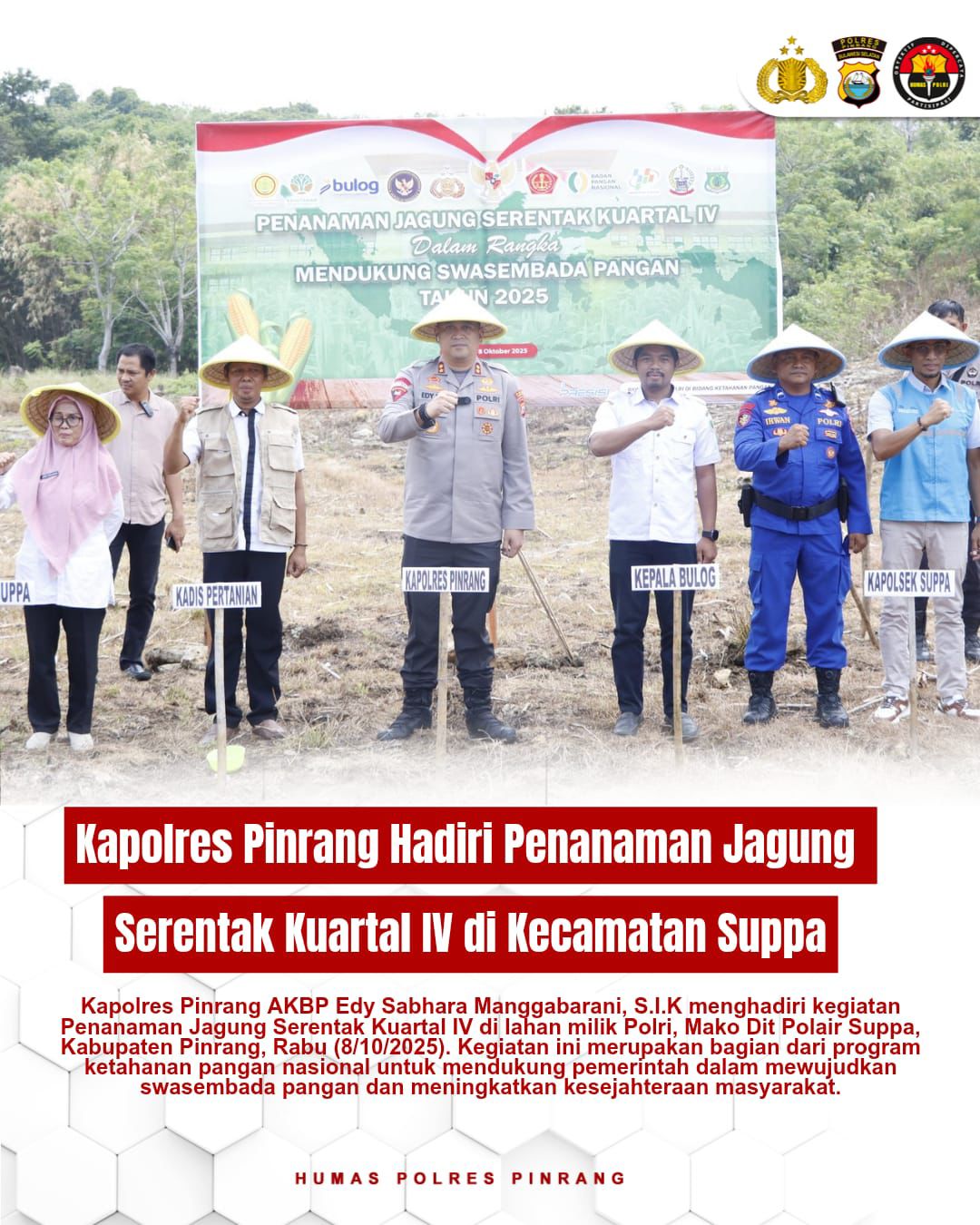 Kapolres Pinrang AKBP Edy Sabhara Manggabarani, S.I.K menghadiri kegiatan Penanaman Jagung Serentak Kuartal IV di lahan milik Polri, Mako Dit Polair Suppa, Kabupaten Pinrang, Rabu (8/10/25).