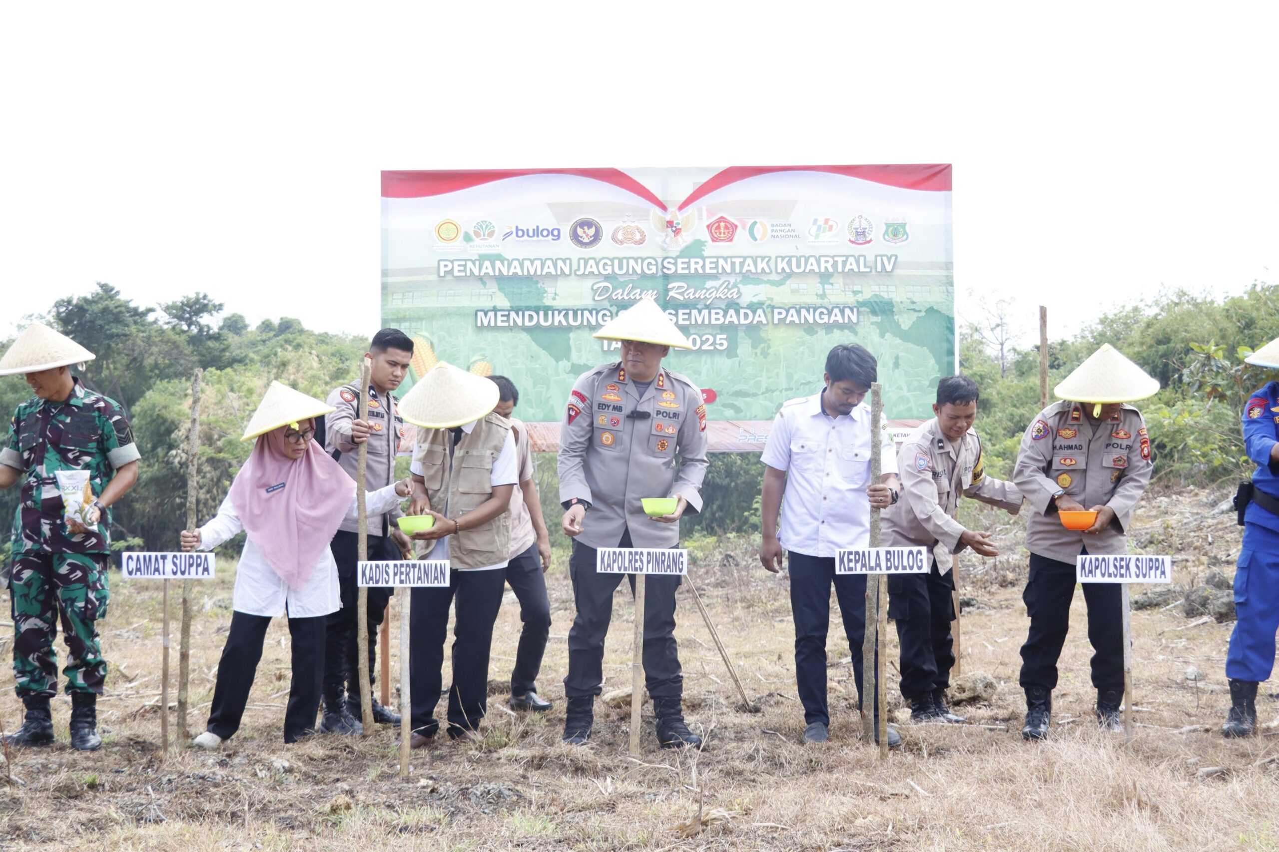 Penanaman jagung dilakukan secara simbolis oleh Kapolres Pinrang bersama unsur Forkopimca Suppa, pejabat utama Polres Pinrang, perwakilan Bulog Pinrang, Camat Suppa, Danramil Suppa, serta para kepala desa, kelompok tani, dan pengurus Bhayangkari Cabang Pinrang. Kegiatan tersebut disambut antusias oleh masyarakat dan kelompok tani setempat.
