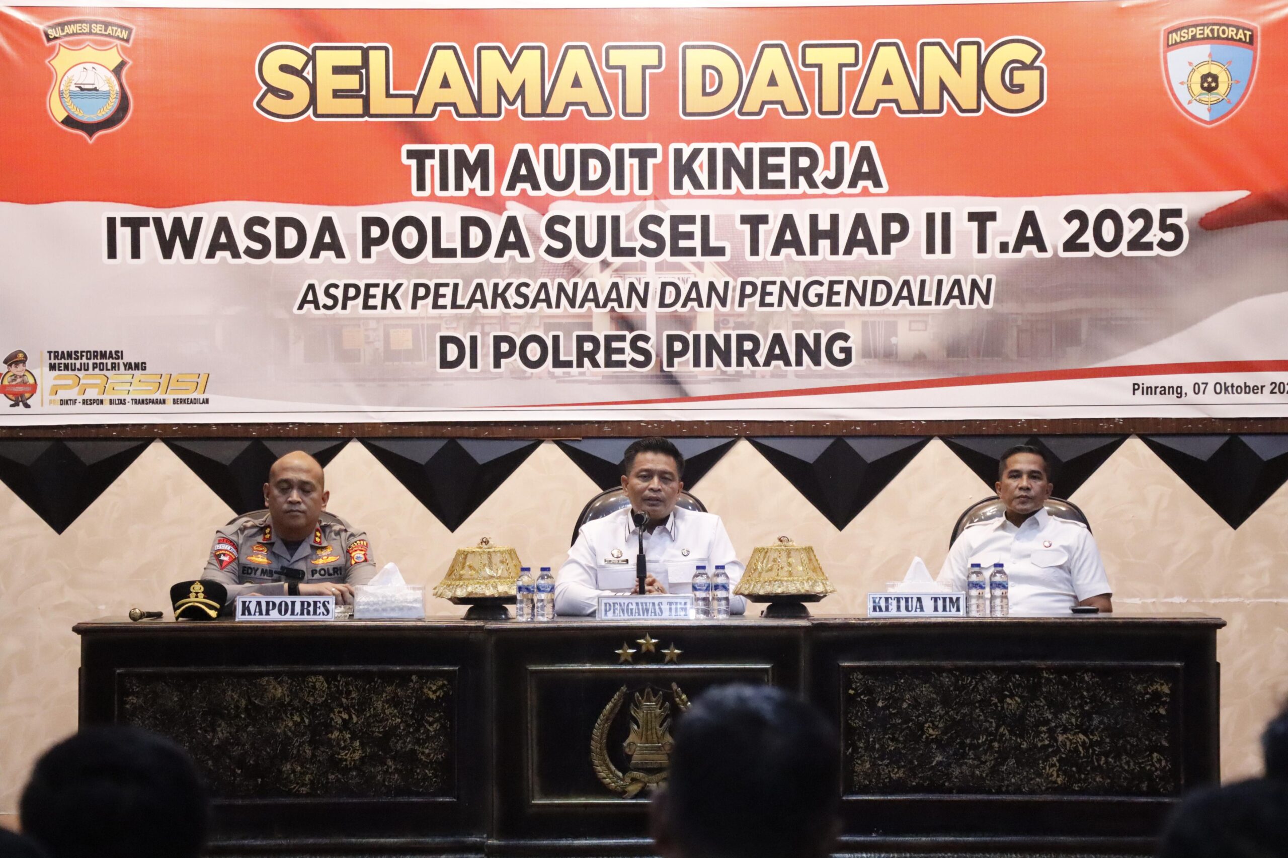 Tim Itwasda Polda Sulsel melaksanakan audit kinerja tahap II Tahun Anggaran 2025 dengan fokus pada aspek pelaksanaan dan pengendalian di Polres Pinrang. Kegiatan tersebut berlangsung pada Selasa (07/10/2025) sekitar pukul 14.30 Wita bertempat di Aula Wicaksana Laghawa Polres Pinrang, Jl. Bintang, Kelurahan Maccorawalie, Kecamatan Watang Sawitto, Kabupaten Pinrang.