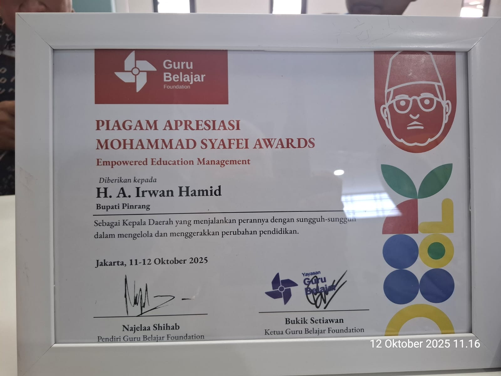 Penghargaan ini diberikan sebagai bentuk apresiasi atas dedikasi, kontribusi, dan dukungan Pemerintah Kabupaten Pinrang dalam memperkuat ekosistem pendidikan yang berdaya, inklusif, dan berkelanjutan.
