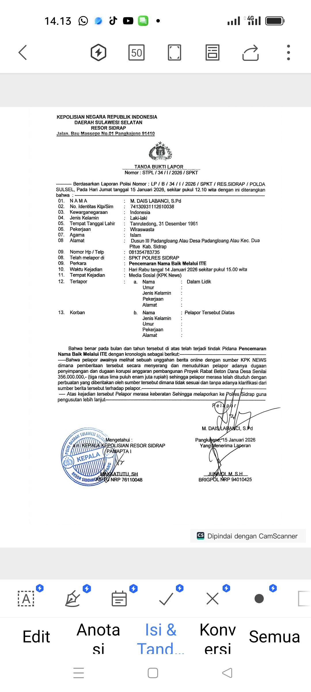 Laporan Polisi (LP), Muh Dais Labanci dengan nomor LP.B/34/II/2026 telah diterima oleh Reskrim Polres Sidrap pada 15 Januari 2026, terkait laporan Muh Dais Labanci, Kepala Desa Padangloang Alau, Sidrap, yang melaporkan oknum Ashadi atas tuduhan pencemaran nama baik.