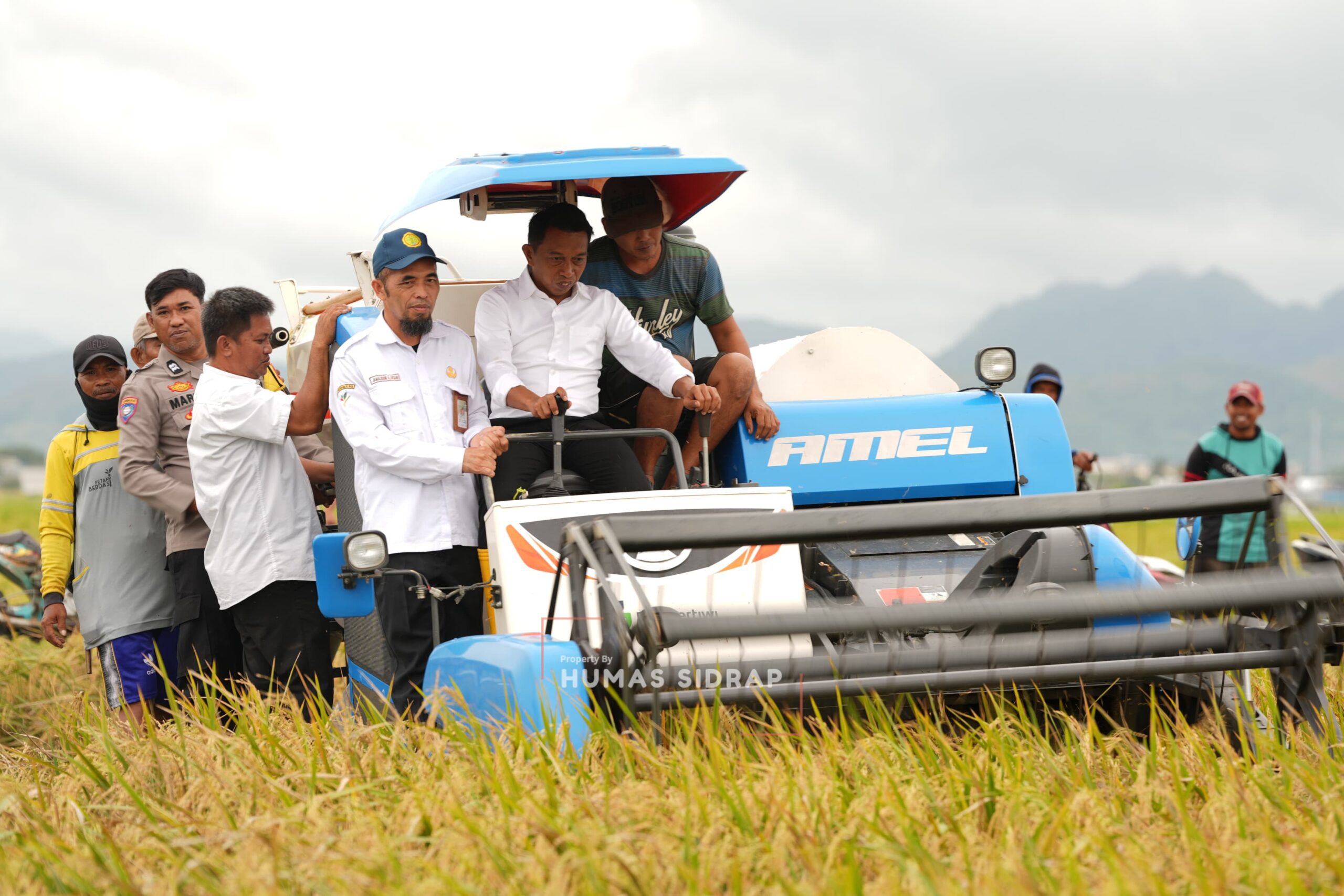Bupati Sidrap Syaharuddin Alrif bersama Kepala Balai Besar Pelatihan Pertanian Batangkaluku, Jamaluddin Al Afgani, melakukan panen perdana Musim Tanam Pertama (MT I) di Desa Sereang, Kecamatan Maritengngae, Rabu (28/1/2026).