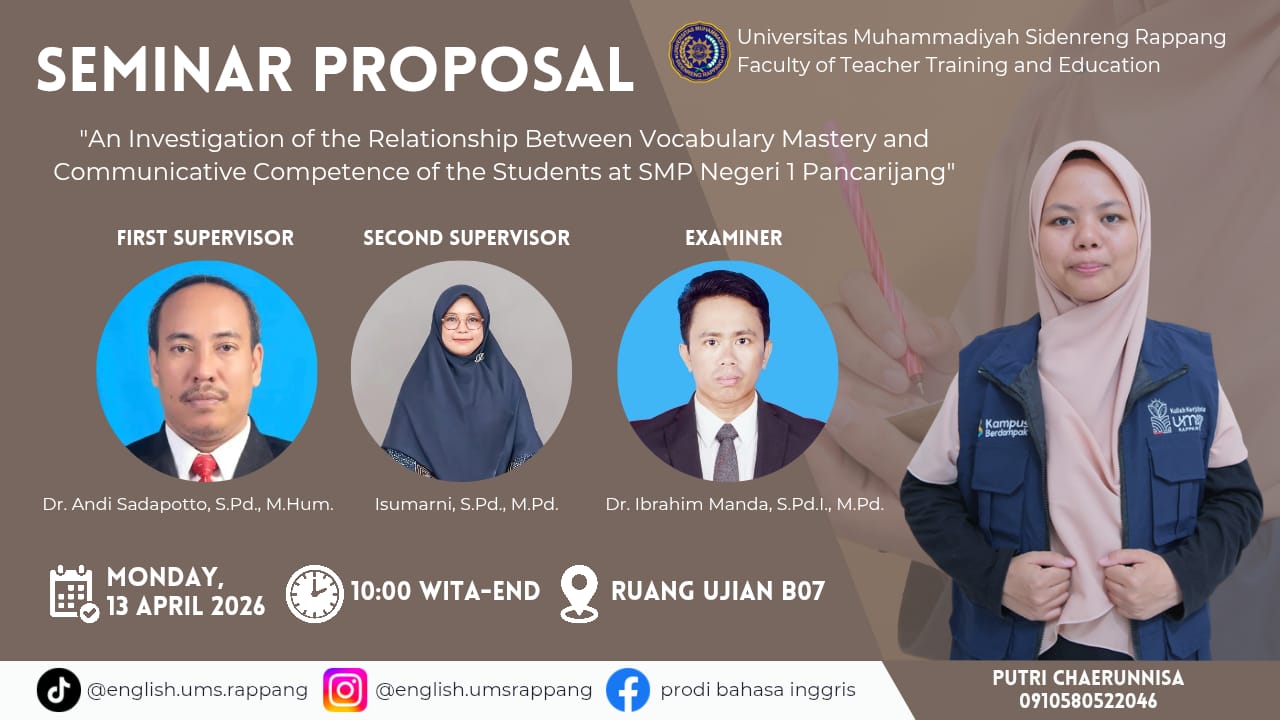 Metromilenial online com, SIDRAP – Fakultas Keguruan dan Ilmu Pendidikan Universitas Muhammadiyah Sidenreng Rappang (UMS Rappang) menggelar seminar proposal skripsi, Senin (13/4/2026). Kegiatan berlangsung di Ruang Ujian B07 mulai pukul 10.00 WITA.