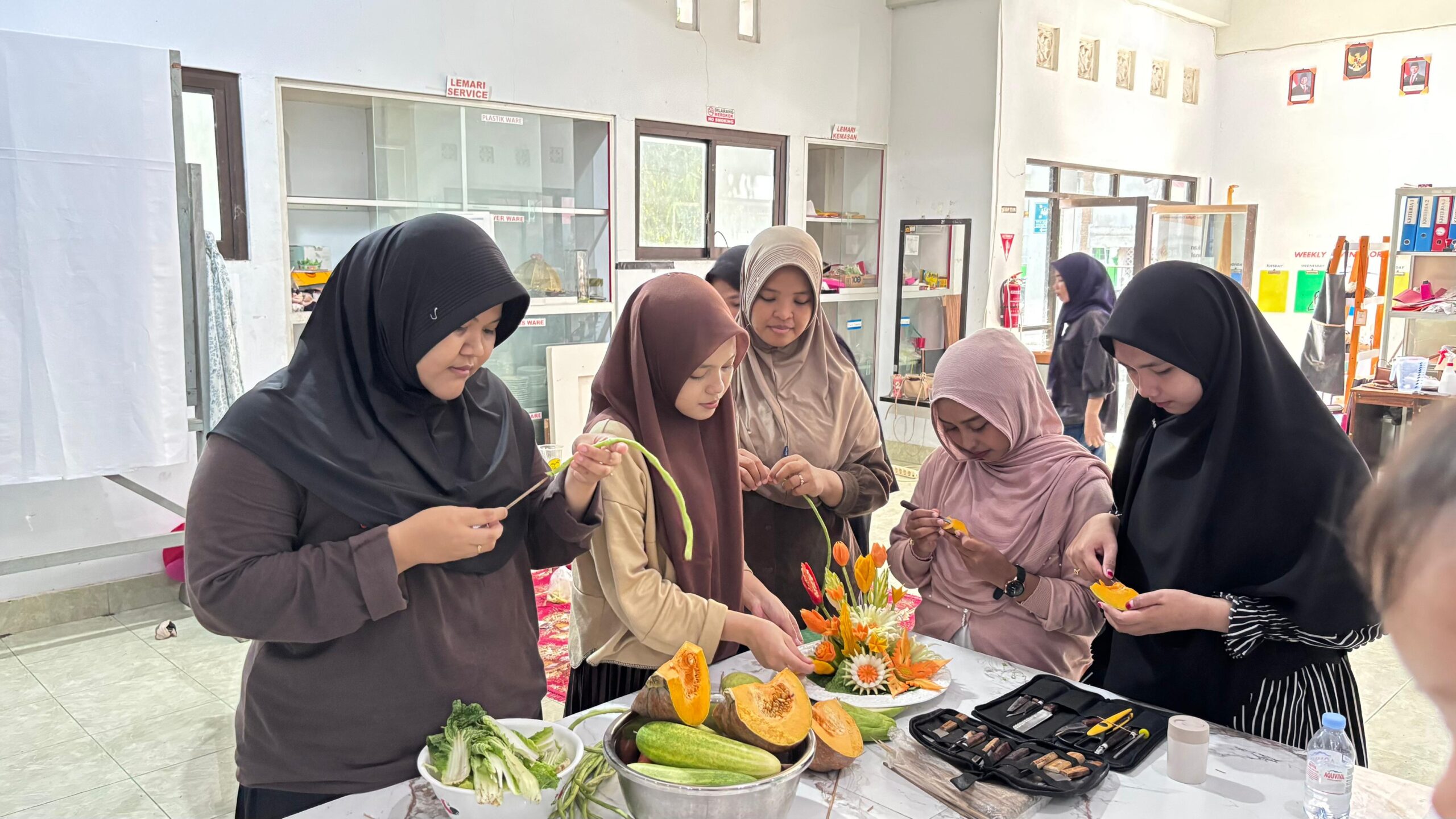 Kegiatan yang berlangsung di laboratorium kampus ini menghadirkan beragam karya vegetable garnishing yang memadukan unsur imajinasi dongeng dengan teknik dekorasi berbahan dasar sayuran.