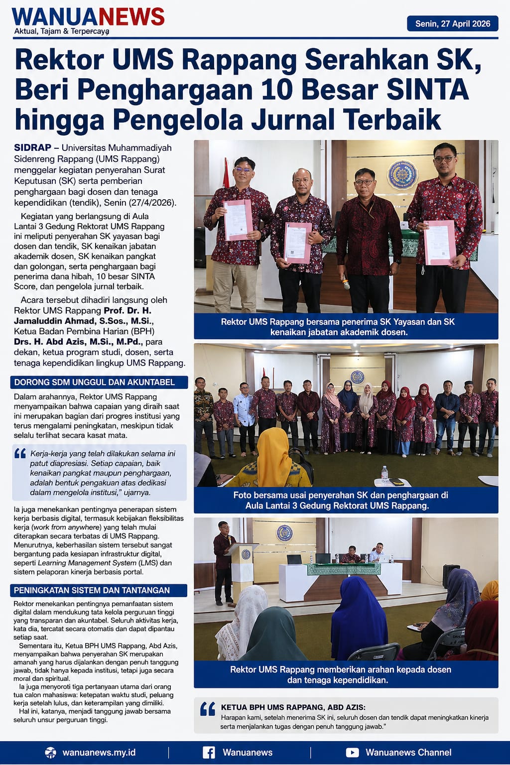Metromilenial online com, SIDRAP — Universitas Muhammadiyah Sidenreng Rappang (UMS Rappang) menggelar kegiatan penyerahan Surat Keputusan (SK) serta pemberian penghargaan bagi dosen dan tenaga kependidikan (tendik), Senin (27/4/2026).